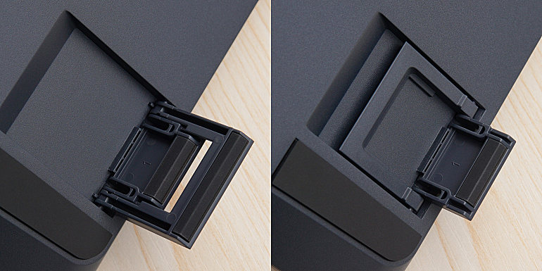 ▲脚架采用双层设计,十分贴心,两层都有橡胶防滑,大致测量了一下,一层撑起后会垫高1cm,二层撑起后为2cm,按个人喜好调节。脚架的尺寸比较大,这让笔者想起多年前购买的老款樱桃,脚架小的可怜,稍微左右移动就把脚架给怼着收回去了,但在E401上就不会有这个问题。