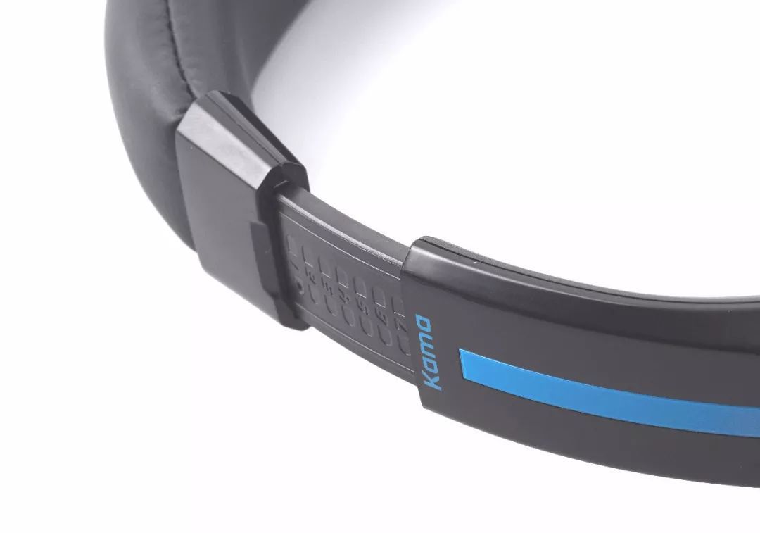 TRITTON Kama+外形小巧,轻薄化方面做得不错,全重仅0.22kg,非常轻巧,戴在头上完全没有负担。即便耳机做得如此轻巧,头梁内部依然采用了金属材质,坚固耐用有保障。耳机整体以黑色为主色调,通过搭配高亮表面、亮蓝色英文字符和线条以及耳罩背面的LOGO印花,给人以个性张扬的感觉,彰显出游戏产品的定位。