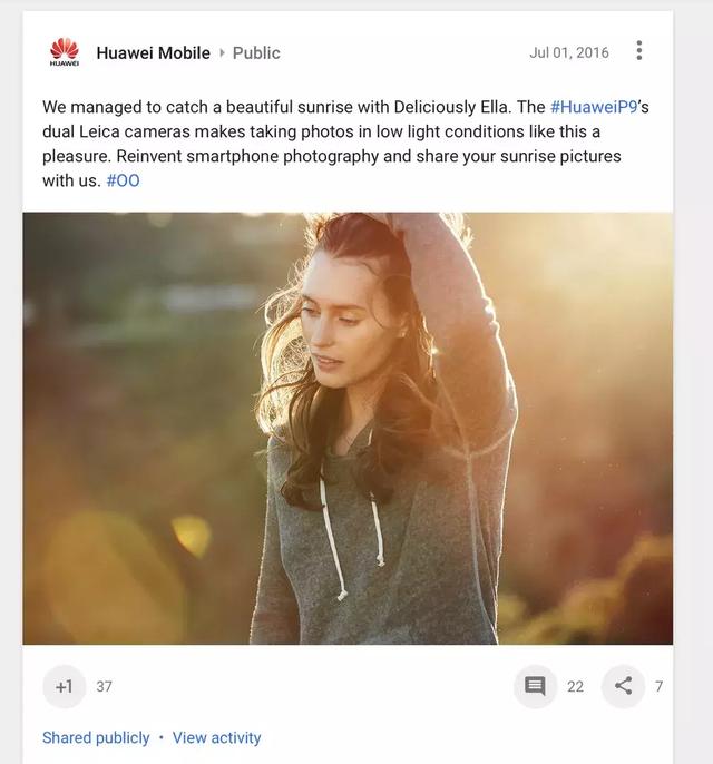 P9发布前夕,华为也是进行了一系列预热宣传。在国外社交媒体上发布的这条动态中,虽然没有明确说明此照片是由华为P9拍摄,但其中“我们设法拍到了阳光下美丽的Ella,华为P9徕卡双摄使得这种弱光情况下的拍摄更简单”等语句,似乎有些暗示此照片与P9的拍照功能之间的关系。