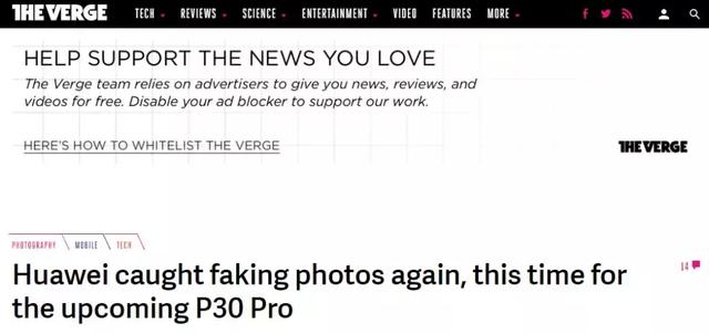 知名外媒The Verge发布文章表示,华为样张造假,用来当海报的照片并不是P30系列手机拍摄的,而是由专业相机拍摄的图库照片。并且他们还进一步指出,这不是华为第一次进行样张造假。