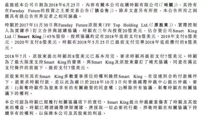 2017年11月30日,香港时颖与FF公司原股东FF Top Holding(贾跃亭实际控制)签订协议,共同投资成立一家名为Smart King的公司。时颖持有该公司45%股份,FF Top Holding持股33%,剩下的22%为预留员工持股。