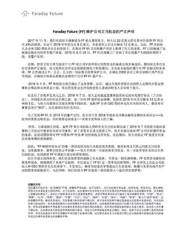 今日,法拉第也发出公告,称是恒大违约在先,并表示,2018年7月,恒大主动提出签署原投资协议的补充修订协议(三方协议),并同意在原合约约定日期之前,进一步向FF提供资金保障,包括在2018年内支付剩余12亿美元中的5亿。