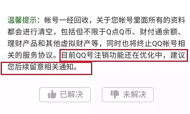彼时按照测试信息看,申请注销前需及时备份帐号重要资料,注销申请一旦通过那么用户数据、资产将清零,QQ号码也会被腾讯回收。也即是说用户帐号里面所有的资料都会进行清空,包括但不限于Q点Q币、财付通余额、理财产品和其他虚拟财产等,同时也将终止QQ帐号相关的服务协议。