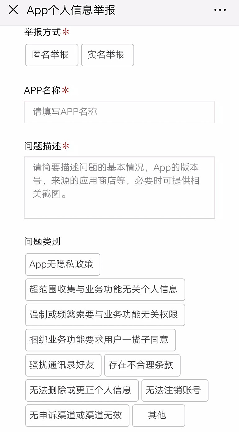 用户关注“App个人信息举报”微信公众号后,点击“我要举报”,便可查看“举报指南”,然后填写举报信息:App名称、问题描述、问题类别等,需要用户简要描述App问题的基本情况,以及App的版本号以及来源的应用商店等,必要时可提供相关截图。