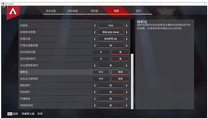 从测试结果来看,技嘉GeForce RTX 2060 GAMING OC PRO 6G的表现比较不错。1080P下最低帧速没有低于60fps,2K下有着远超60fps的平均帧速。游戏中有几个对帧速影响比较大的地方,如跳伞时、铝热剂手雷爆炸、烟雾弹和全屏大招的时候。追求极致流畅但又不愿意降低太多画质的玩家,可以调低“环境光遮蔽质量”,由于《APEX英雄》的画面风格比较明快,“环境光遮蔽质量”对画面的影响不大,同时还可以关闭“体积光”,也能节省一些GPU资源。