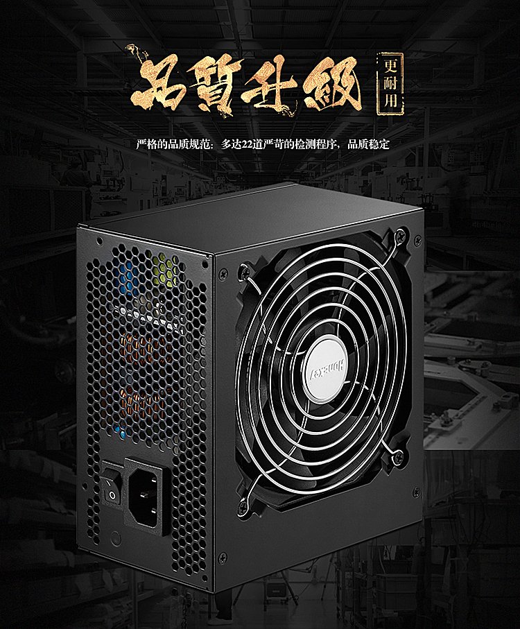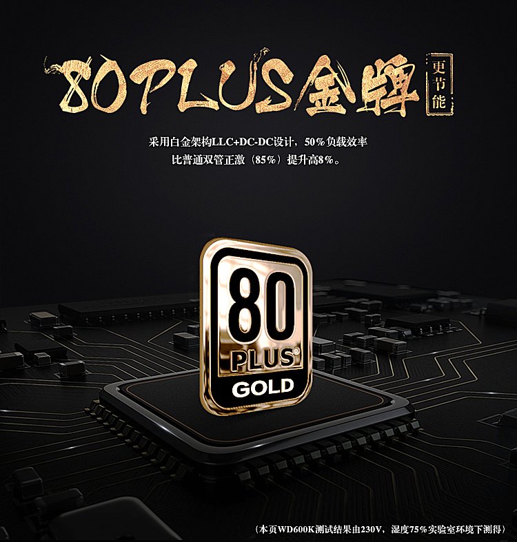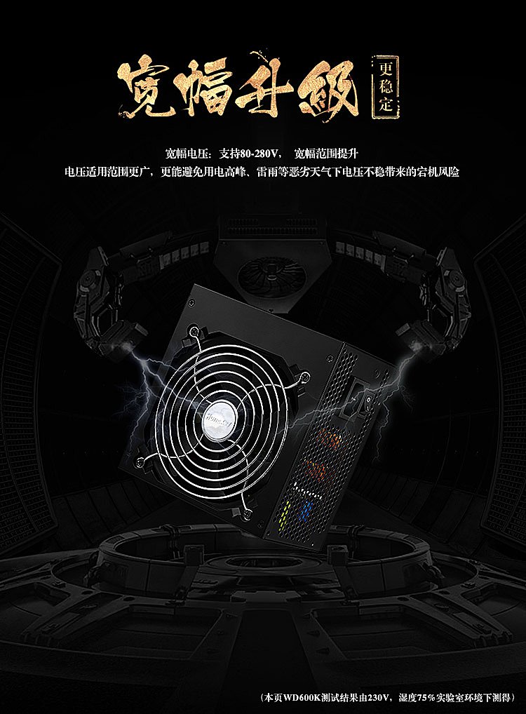 航嘉WD600K金牌电源支持80-280V,宽幅范围提升20%,使得宽幅电压升级,电压适用范围更广,更能有效避免用电高峰、刮风打雷等不同环境下电压不稳而带来的宕机风险。同时,更精准输出:DC-DC稳压设计,电压稳定性可达1%,稳压精度提升50%,保证游戏平台各硬件更有效发挥各自的性能。更稳定输出:+5V/+3.3V独立控制环路,有效应对用户在电竞游戏时不同的用电环境。单路45A强电流,并且满足N卡/A卡高端旗舰显卡供电需求,让电竞玩家在DIY各类大型游戏中随心所欲。