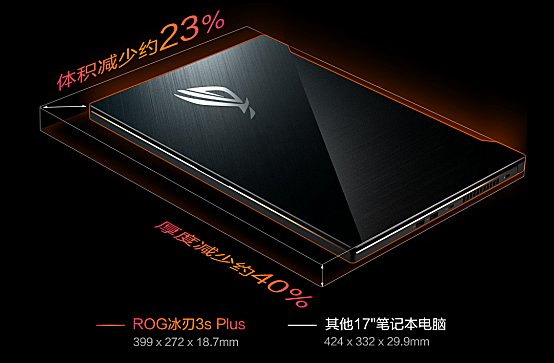 得益于精湛的轻量化设计和窄边框技术,ROG冰刃3s Plus能够将17.3英寸的屏幕装进传统的15英寸机型当中,同时厚度薄至约18.7mm,相比市面上其他17英寸游戏本,ROG冰刃3s Plus体积减少约23%,厚度减少约40%。超薄机身为空气流通只留下很小的空间。
