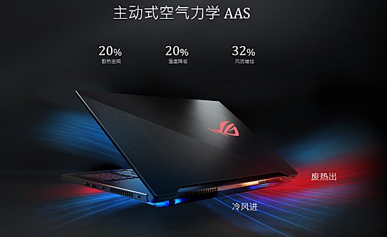而冰刃3s Plus还搭载GeForce RTX 2080搭载Max-Q设计显卡,散热无疑是最大挑战。为了避免影响性能,ROG设计了一个全新的散热系统——冰川散热架构,当打开外盖时,ROG冰刃3s Plus能让底部自动敞开,增加内部的散热气流流通。