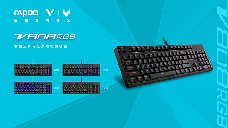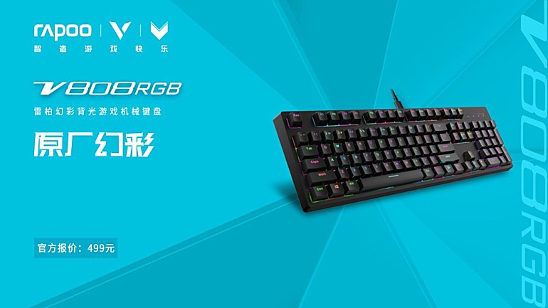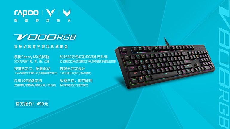 搭载樱桃Cherry RGB原厂机械轴的雷柏V808RGB幻彩背光游戏机械键盘2019新春上市。