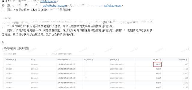 如下图所示,抽取蚂蚁金服转发至拼多多公司的风控关注邮件,单日此类商家通过支付宝二维码发生可疑性交易的金额从2019年4月12日至2019年4月17日呈现逐次下降趋势,从最高日的94万元/日下降至60万元/日。与差评文中所言——“预估这块业务在拼多多的日 GMV( 成交额 ),达到五亿元……”,实际情况相差六七百倍。