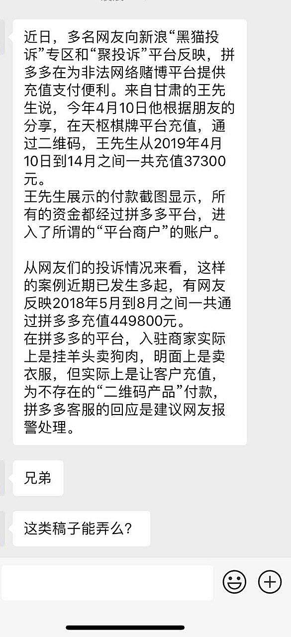 2、“实际上,随着网络支付技术的发达,线上洗钱方式也花样百出……感谢下沉,感谢扩张,拼多多店铺解决了这诸多麻烦……换言之,拼多多,成了博彩网站收款的支付通道……简言之,博彩网站的非法赌资经过拼多多这么一道,被洗白了。”