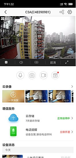 萤石C3A和萤石其他网络摄像机类似,预留TF卡插槽,最大支持128GB的存储卡,而且还支持云存储服务,避免设备盗窃导致数据丢失。萤石C3A随机附送有7天循环30天时限的云存储服务,到期后用户可以自行购买不同容量的云录像服务,1年服务期限的优惠价格是120元。另外,C3A还带有双向语音对讲、APP远程查看等实用功能,并提供了超清、高清和均衡三种视频码率的自适应原程预览。