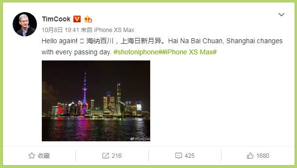 此次库克上海之行,早在10月8日晚上,库克就在微博爆料,发文称“海纳百川,上海日新月异。”