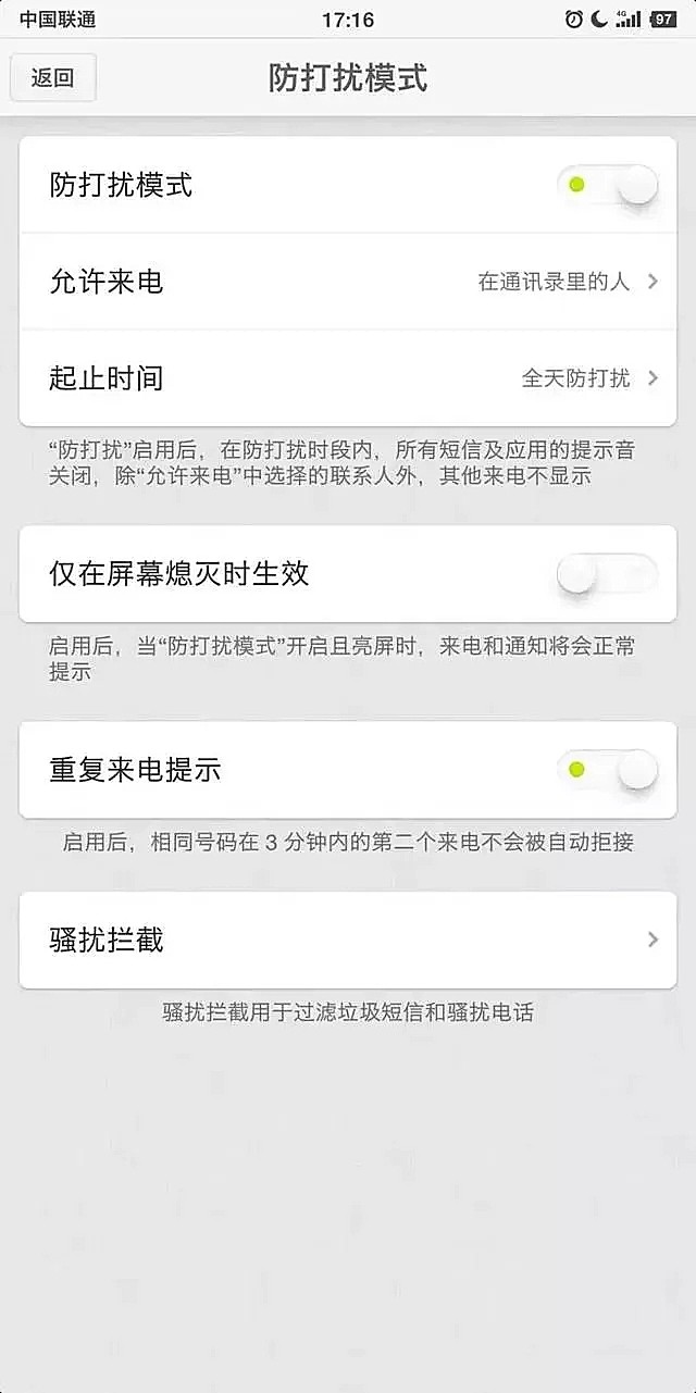 除了运营商级别的防骚扰,其实你的手机也可以做很多,以小编手中的某安卓手机为例,可以选择打开放打扰模式,打开后还可以详细设置允许来电范围及起止时间,一般来说,设置为允许来电范围为在通讯录里的人在配合启用重复来电提示,就基本上能免除骚扰电话的同时也不漏接陌生的重要来电了:通常来说电销业务员在无法接通后就会放弃拨打这个号码或者缓一段时间再打(通常在10分钟以后),而真的很急的电话,比如手机没电了只能用陌生电话联系的情况肯定会不时地就打进来;