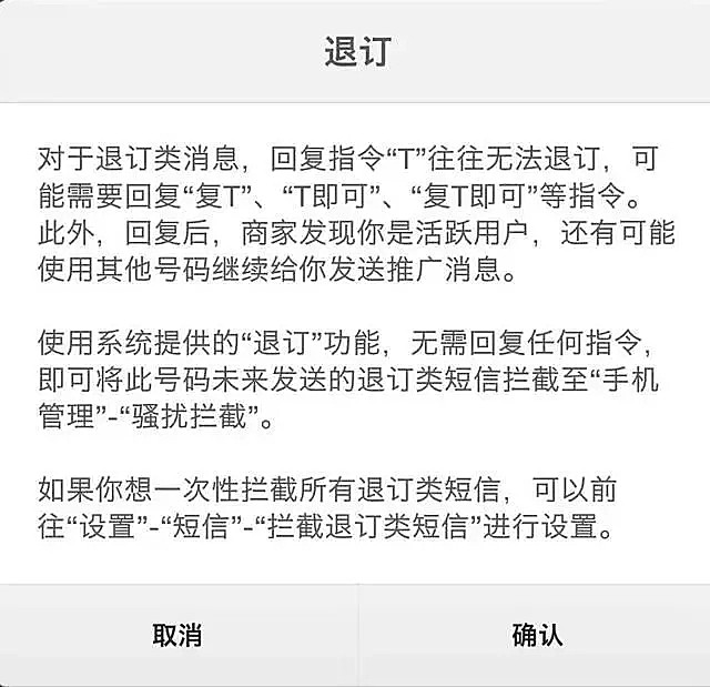 还有退订类骚扰短信,之前 网传推定的各种套路在我点击退订按钮的时候就已经实现了免疫,这样礼貌而不失优雅的方式,对方一定不会再给我发保险短信了。
