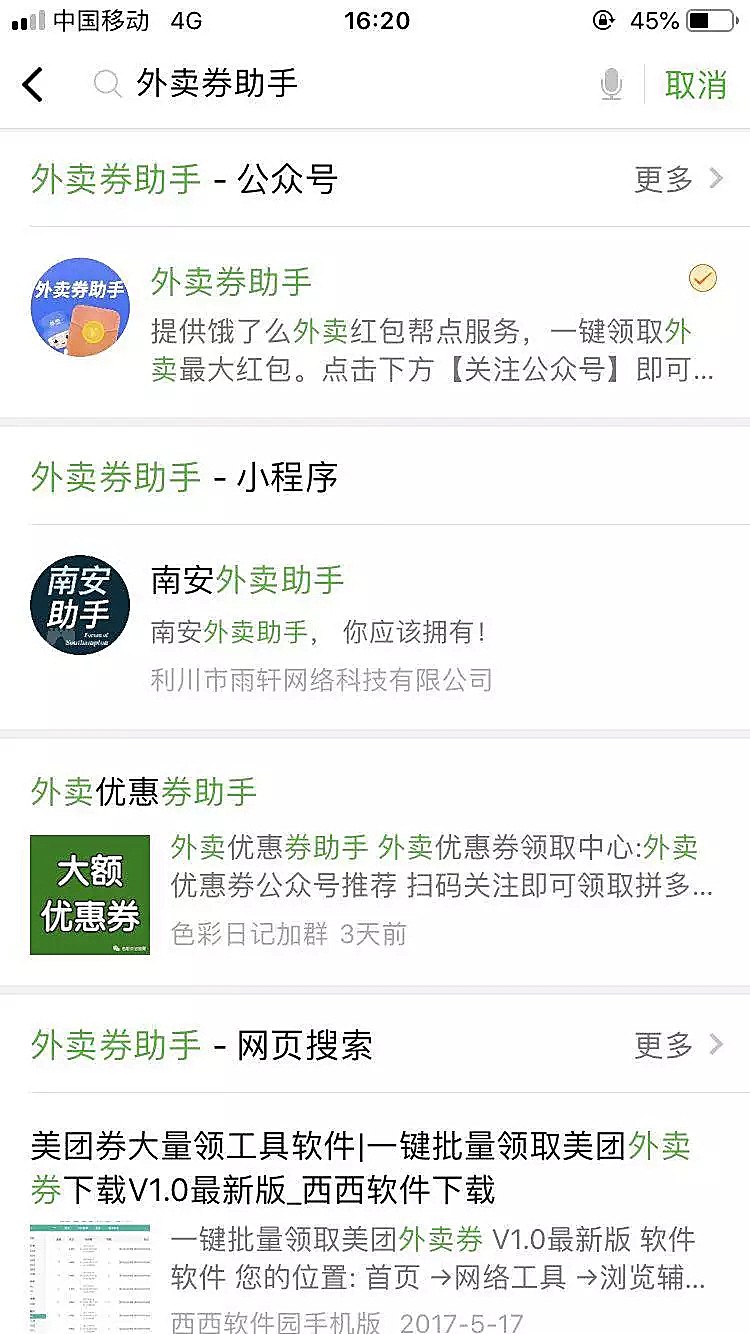 在外卖红包互助群里,有网友在群里分享了几个帮抢外卖最大红包的公众号,其中一个名为“外卖券助手”的公众号,专门提供饿了么外卖红包帮点服务,让你一件领取外卖最大红包。
