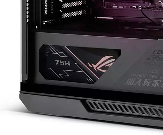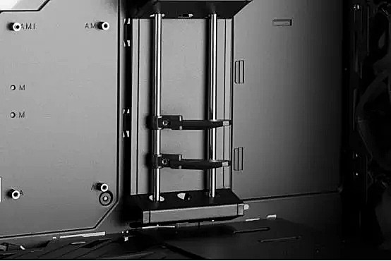 为了方便玩家使用,HELIOS内部还提供了多功能装甲,通过这个装置,不但可以帮助玩家遮挡电源线和走线孔,还能提供显卡支架的功能,并且还可以多提供一个安装ROGAURA灯效控制器或一个2.5英寸硬盘的位置。