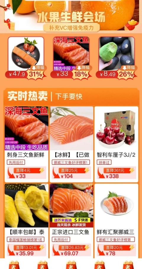 “消费者可以在拼多多放心购买挪威三文鱼。”上海盒成网络科技有限公司电商负责人刘艺表示,公司在拼多多上销售的三文鱼,皆选自全球优秀产区——挪威、智利。随着春节临近,作为一道众多消费者青睐的“硬菜”,三文鱼登上了今年拼多多“年货节”清单。