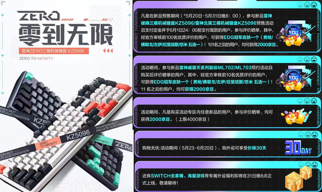 续航方面,雷神ZERO三模机械键盘配备3000mAh大容量电池,支持定制休眠技术,另外键盘灯效拥有16种RGB背光灯效+10种音乐律动,为玩家呈现出更多缤纷视觉效果。现在逛【雷神京东自营官方旗舰店】参与618提前购活动,即可享受一下福利:凡购买4种不同品类外设且满足≧8件的用户,晒单评价且实付金额最高前8名的用户,可获得价值1299元雷神电竞椅一把;凡购买三种不同品类外设且满足≧6件的用户,晒单评价,即可获得6180个京豆;凡购买外设≧2件的用户,晒单评价即有机会获得Switch全家桶(switch主机+3款热门Switch游戏+G40手柄)一个。