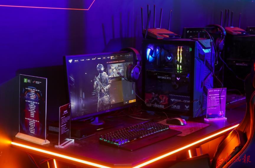新款TUF GAMING LC 240 ARGB破冰手水冷散热器、TUF GAMING突击手650W电源、TUF GAMING GT301火枪手机箱和TUF GAMING K3机械键盘、TUF GAMING H3电竞耳机、TUF GAMING M3游戏鼠标以及TUF GAMING P3游戏鼠标垫,也给玩家们带来了性能和颜值的双重享受。为“千千万兄弟”加速的则是TUF GAMING AX5400电竞路由器,软硬双重加速。满满的CFHD元素的定制版机箱,也引得不少玩家驻足围观。