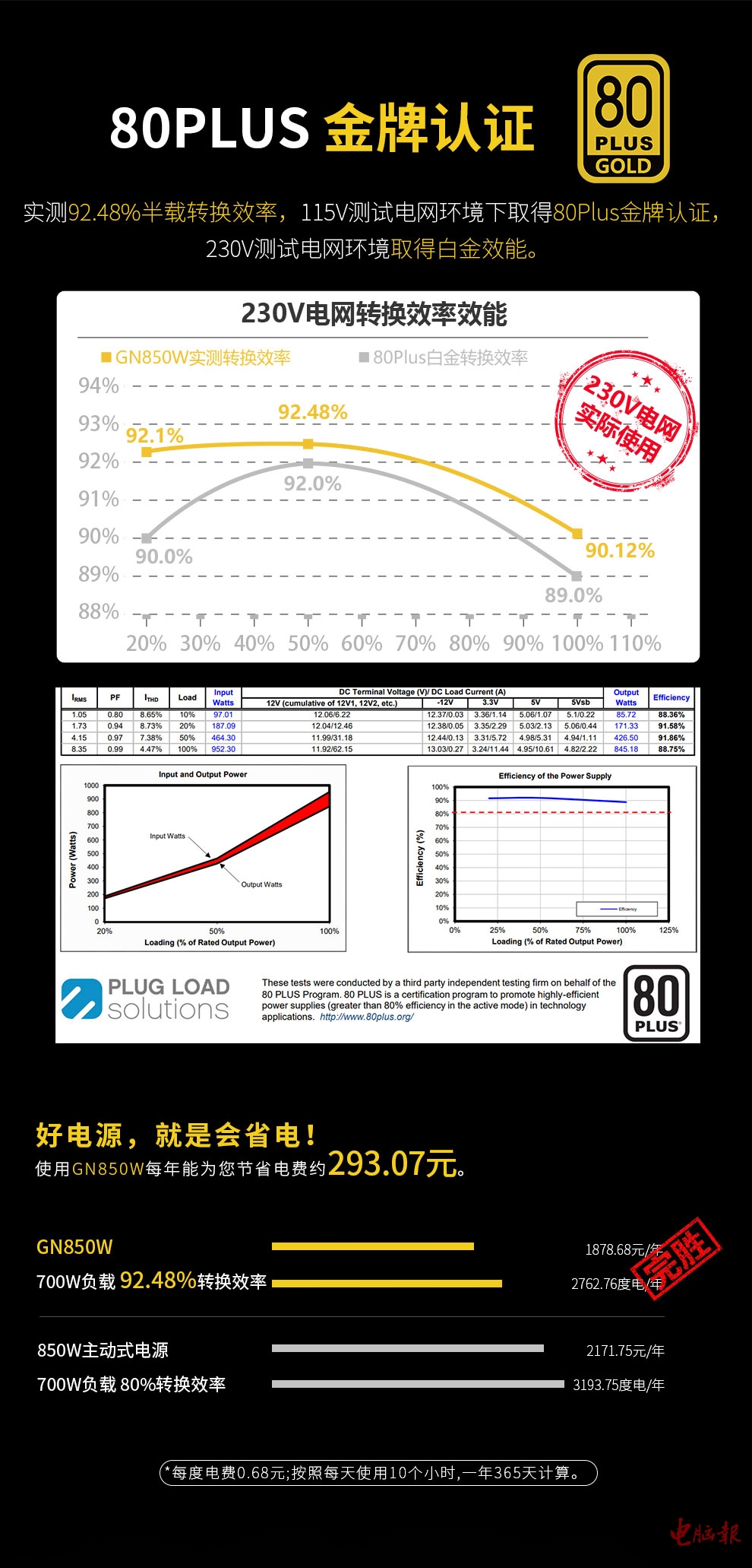 虽说都经过80PLUS金牌认证,但以GN850W为例,其实在230V的实测电网下,其转换效率已经达到了80PLUS白金效能的认证标准了,每年能为消费者省下的电费比想象的还要多哦!