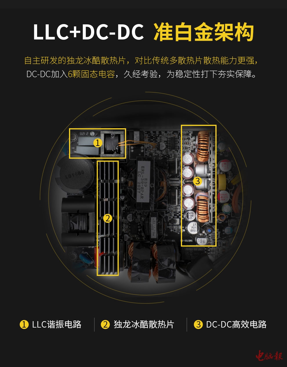 电源内部架构采用了LLC Pro+DC-DC的准白金架构,用料也十分扎实可靠,在DC-DC中加入了6颗固态电容,保证其使用的高效性与稳定性。