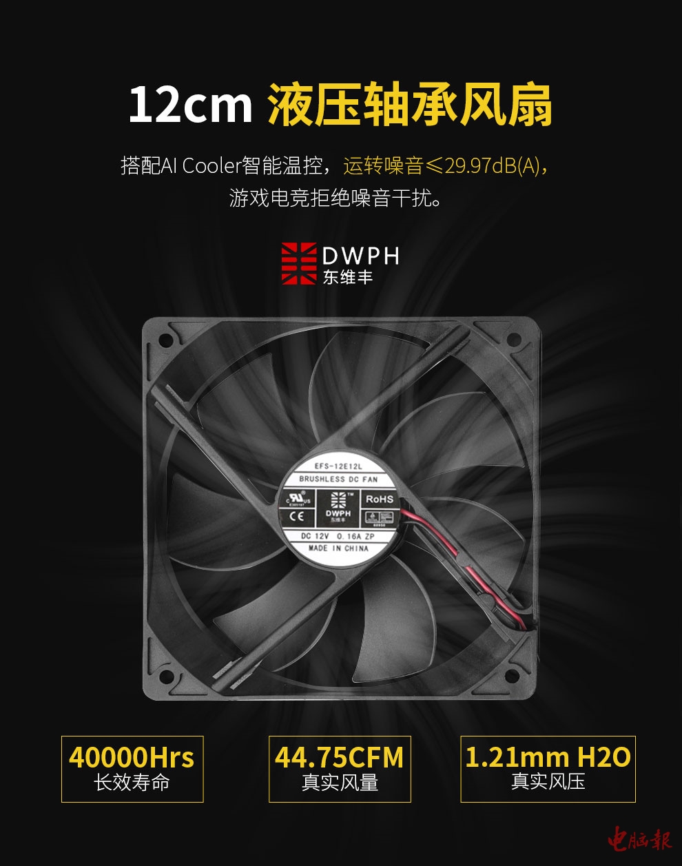 内部搭载12cm的液压轴承风扇,拥有AI Cooler智能温控,使用寿命高达40000小时,运转噪音≤29.97dB(A),五杀的时候不用担心噪音太大分散你的注意力啦!