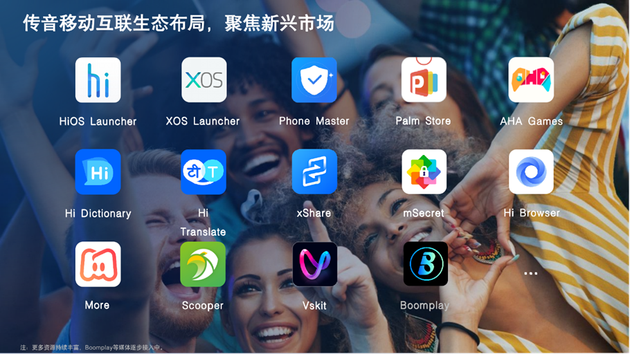 基于在新兴市场智能机领域的领先优势,传音大力发展移动互联业务。传音移动互联承载“数字基础设施”的使命,搭建了全新的商业与技术中台,从开发、测试、推广、变现等环节赋能拓展非洲业务的全球开发者,同时为消费者生活带来便利。