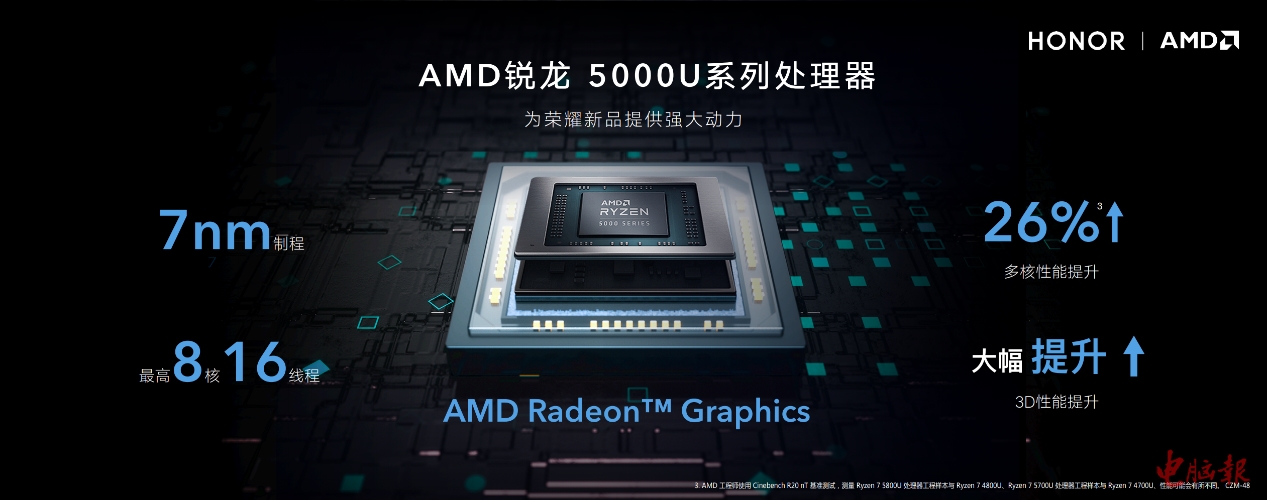 7月14日,荣耀发布了最新款MagicBook14/15锐龙版轻薄笔记本电脑,全新的荣耀MagicBook14/15锐龙版搭载了最新的AMD锐龙 5000 U系列处理器,拥有锐龙5 5500U和锐龙7 5700U两款不同芯片的配置,处理器采用了领先的7nm工艺和最新的Zen3架构,IPC相对上代大幅提升,并且在多线程多任务处理方面,性能表现更出色,既能满足日常任务需求,又能满足生产力需求,综合性能出色。