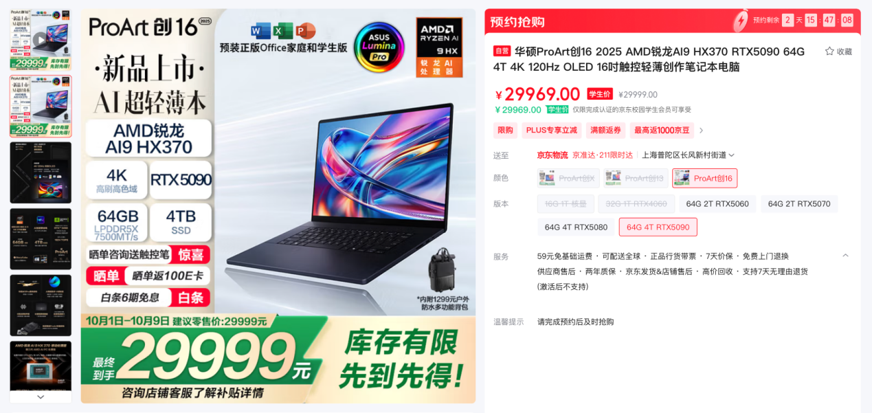 华硕ProArt创16 2025(RTX 5090):https://item.jd.com/100278101128.html