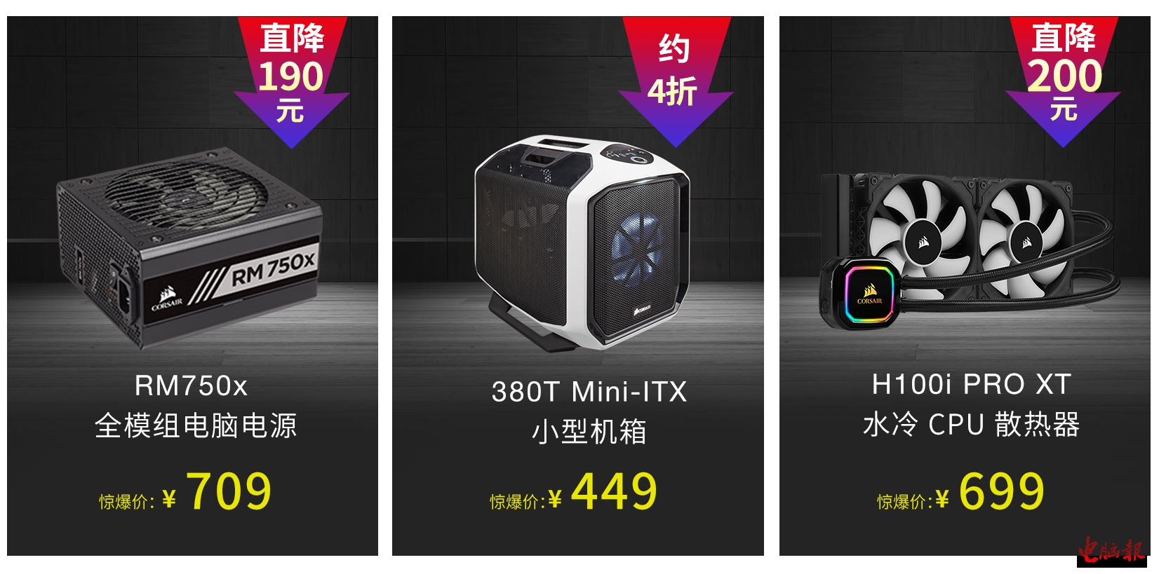 机电方面,依然有约一元一瓦的,能为PC带来稳定充沛的供能的同时保持低噪音的金牌电源RMx系列,还有约四折优惠的支持ATX电源的ITX机箱380T。美商海盗船的新品机箱4000系列与5000系列也同样有史低的优惠。而美商海盗船的高效能水冷PRO XT系列,240冷排的版本也直降200元,699元便可入手这款可以稳定压制高功耗CPU的高性能水冷。