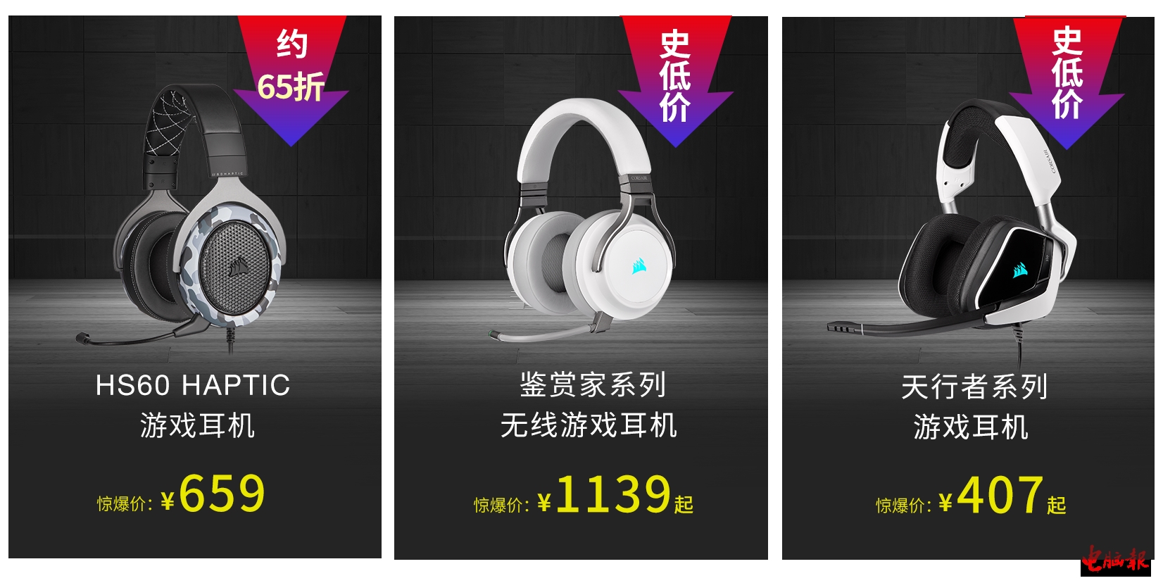 除了有键盘击穿低价之外,美商海盗船的耳机产品线也拥有史低的大额优惠。拥有可调触感反馈系统,辅以高水准音质,可以带来超强沉浸感的HS60HAPTIC耳机,本次618拥有了史低售价659元。不仅拥有高保真音质与广播级麦克风,也拥有精细做工靓丽外观的鉴赏家系列无线耳机,也带来了史低价格——1139元。而经典的天行者系列游戏耳机,也拥有407元的史低起步价。