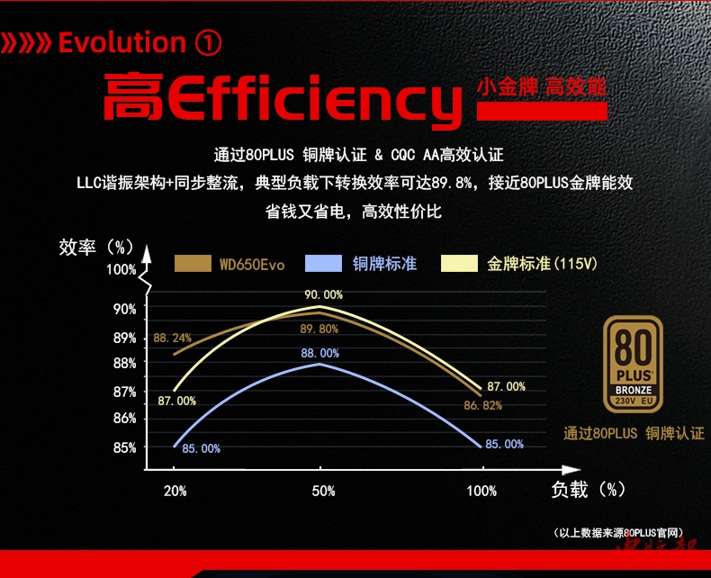 我们可以看出航嘉WD650Evo双认证铜牌电源品质相当优秀。产品采用34mm封闭式PFC,具有增强抗干扰能力,可以有效降低磁损耗。金牌架构,LLC谐振+同步整流SR+DC-DC数字稳压设计,电压精度高,进一步保证了能效比,产品各路输出更稳定。