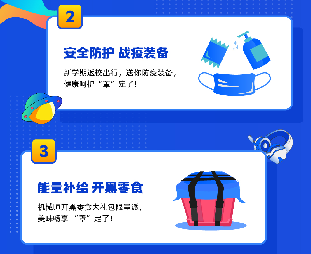 除了可以抽车以外,机械师还准备了超多的开学好礼。在返校的路上,总少不了经过人群密集的地方,也少不了跟陌生人接触,因此,机械师精心准备了由口罩、湿巾、洗手液组成战疫大礼包,全方位守护你返校路上的安全健康问题。与新朋友最快速熟悉的方法就是开黑,而跟开黑最配的当然就是零食啦,机械师准备的零食大礼包,可以边玩边吃,还可以跟朋友们一起分享这份双倍的快乐。想要得到这两份大礼包的方法很简单,只要每天到MACHENIKE机械师公众号签到,就可以获取抽奖机会!