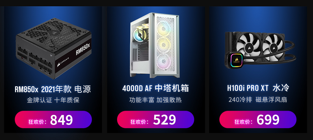 作为高品质电源的代表,美商海盗船的RMx系列金牌全模组电源在2021年进行了更新。而全新的RMx系列本次为大家带来了约1元1瓦的价格。性能拔尖的一体式水冷产品也为大家带来了巨大的优惠,如适用性广泛,性能强悍的H100i PRO XT,仅需699元即可入手。