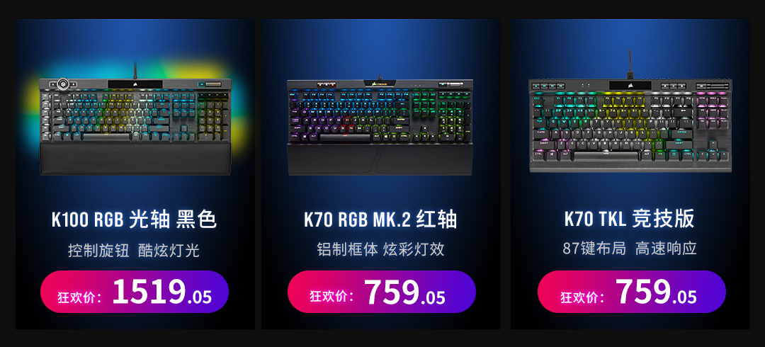 美商海盗船的旗舰机械键盘K100,拥有8000Hz回报率以及44区270度环绕RGB灯带,折上折后来到史低价1519.05元。同样拥有8000Hz回报率的K70 TKL,搭载了Cherry MX原厂机械轴体与高品质PBT双色注塑键帽,折上折后仅需759.05元起。经典的K70 MK.2系列折上折后同样也仅需759.05元。