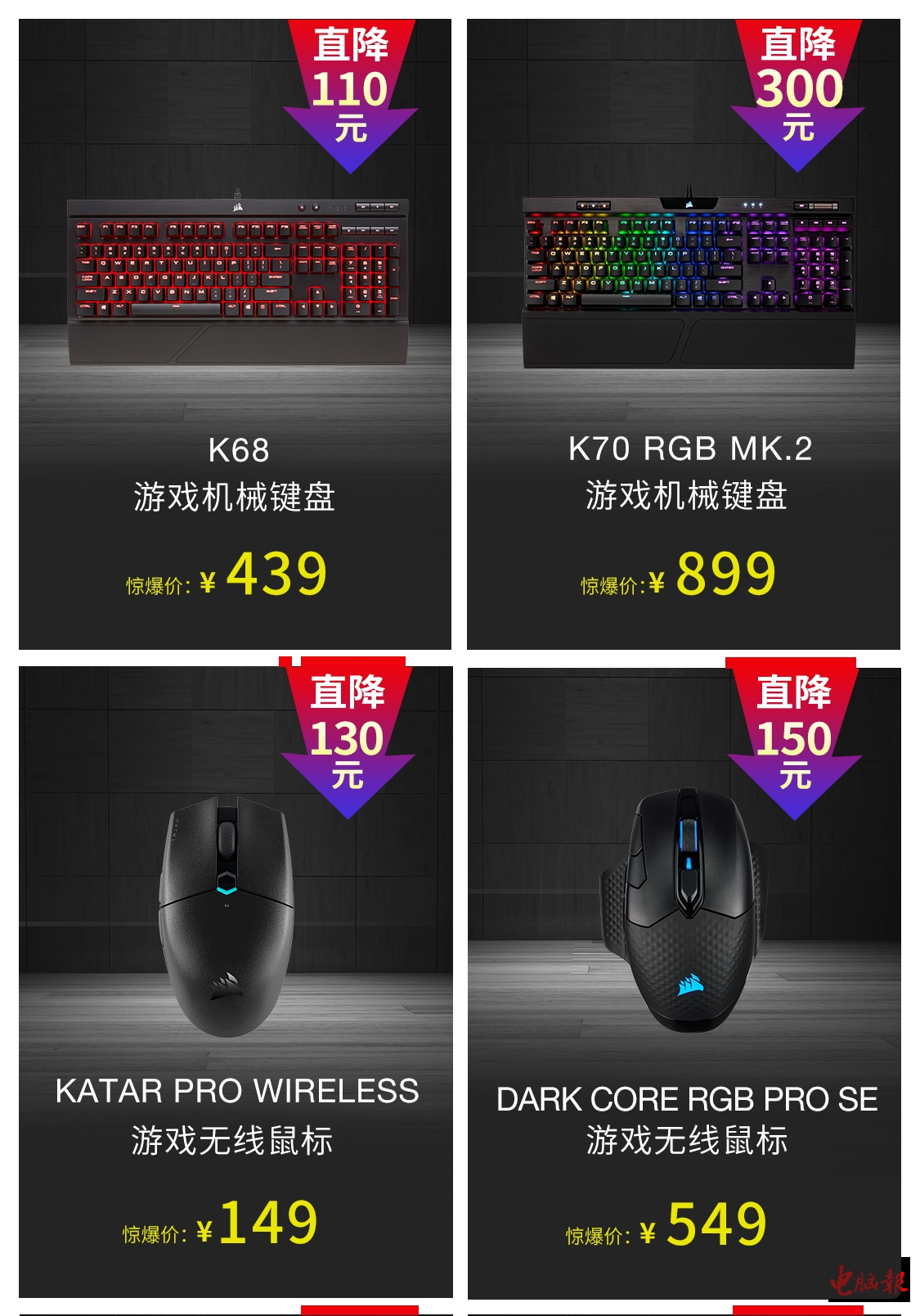 拥有Cherry MX轴体与全尺寸手托的K68机械键盘,无套路直降至439元,前两小时95折到手价仅需417.5元起,经典的K70MK.2 RGB机械键盘,无套路惊爆价899元,前两小时95折到手价仅需854元起。而促销价为149元的蓝牙与2.4G双模无线轻量化游戏鼠标Kartar Pro Wireless,与促销价为549元的拥有低延迟无线技术且支持Qi无线充电的Dark Core RGB Pro SE无线三模游戏鼠标,也均能享受前两小时折上95折的活动。