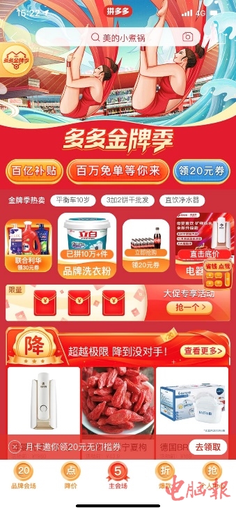 拼多多活动专区热门商品已经吸引数千万消费者收藏下单跑鞋、运动服、瑜伽服、跳绳、球类等大牌体育刚需用品,热门3C数码、健康饮食类商品在开售的12小时内即库存告急,平台和商家全力补足货源,带来20天狂欢大促的更优体验,阿迪达斯和特步等各大知名体育品牌在拼多多开设的官方旗舰店和官方奥莱店更有正品大牌低价商品全年热销,为奥运健儿鼓劲加油。