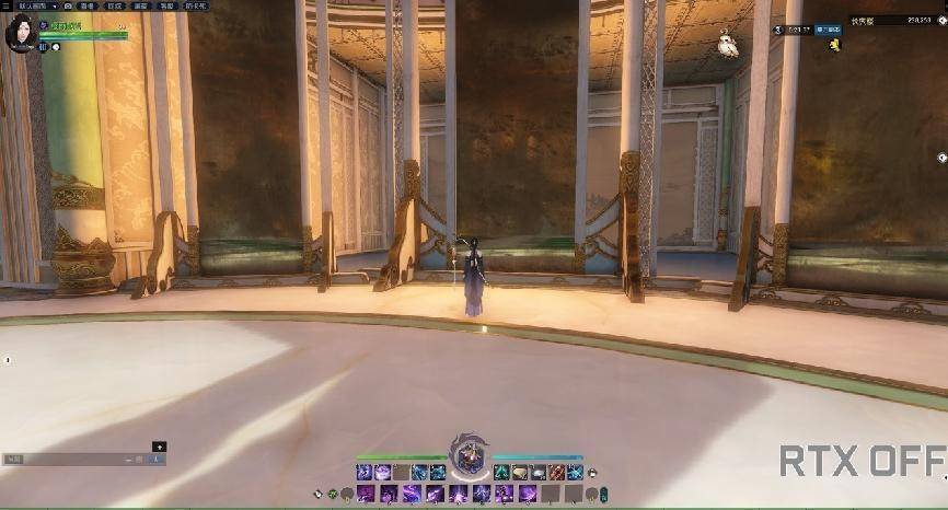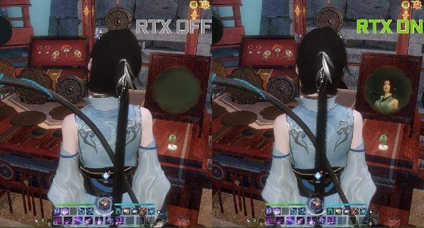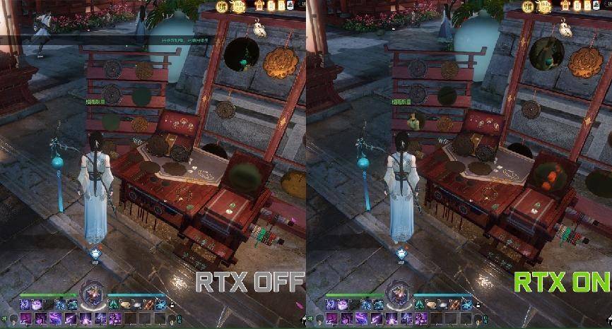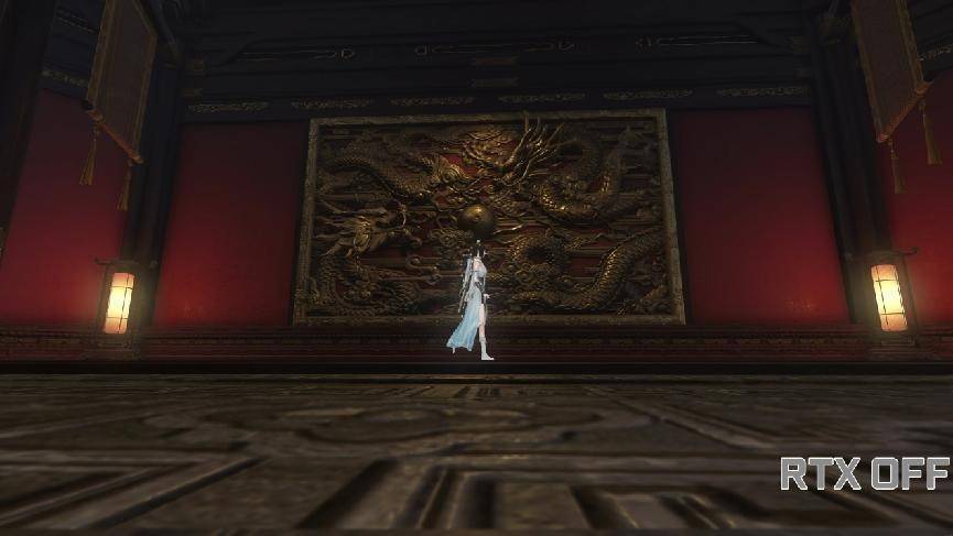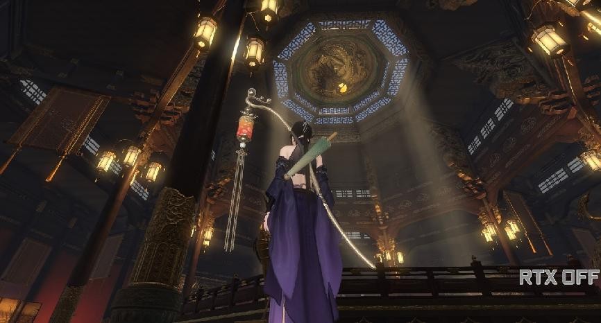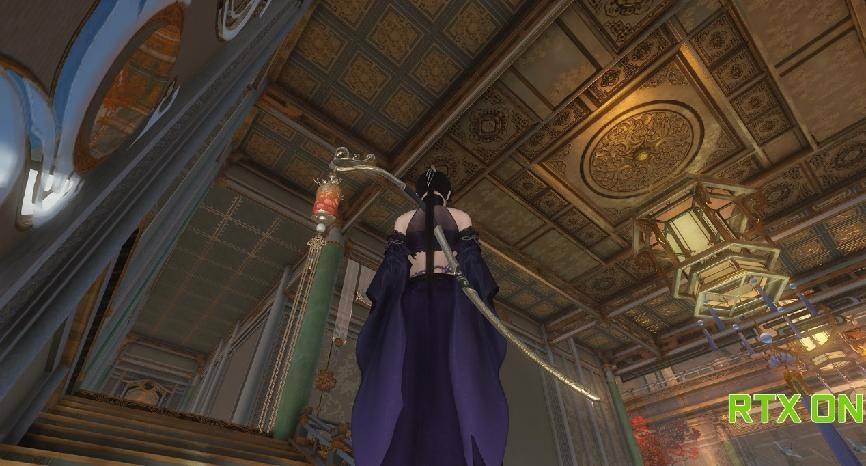 右文殿场景有着金碧辉煌的装潢,从对比画面我们可以看到,开启和关闭光追时,画面呈现出类似开灯和关灯的效果,这就是RTX GI在游戏中最直接的效果呈现。当然,这并非是因为开启光追后加入了更多的光源,而是因为有RTX GI的加持,使得游戏环境中的光线模拟了实际环境中光线的反弹效果,导致处在阴影或者暗部的物体表面因为间接光照的原因也变亮了起来。