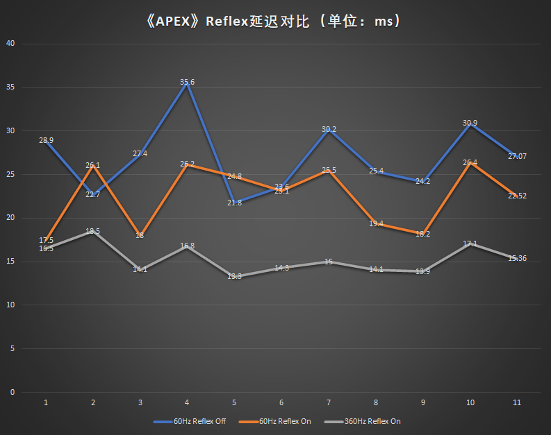 测试时,我们在训练场进行了“60Hz+关闭Reflex”、“60Hz+开启Reflex”和“360Hz+开启Reflex”三种状态下的对比。每种状态下射击10次,记录每次的延迟数据(Reflex显示器上显示的延迟)并计算最终的平均延迟。