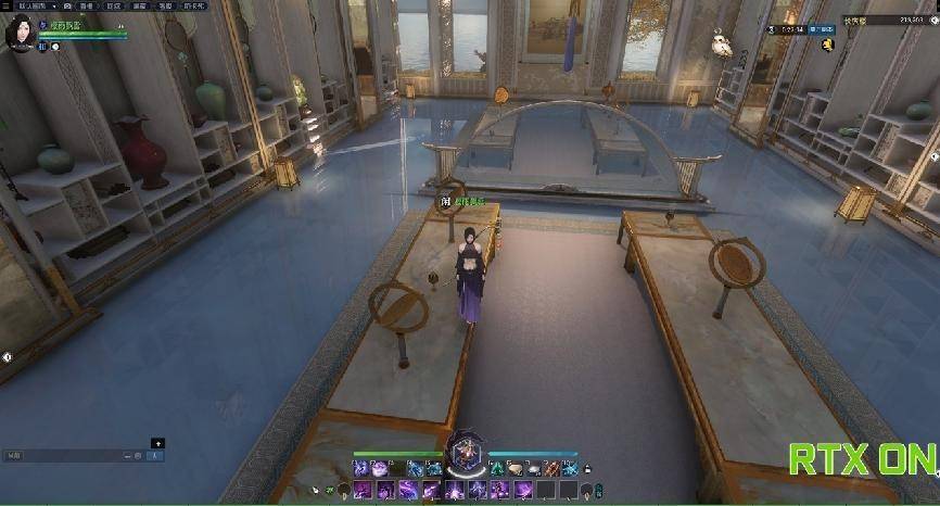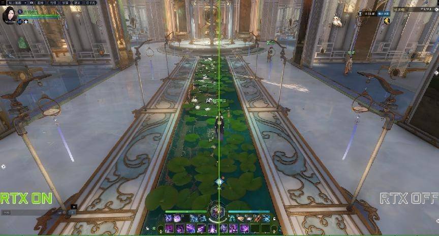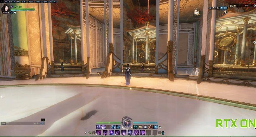 开启光线追踪后,长庆楼中的水面和大理石地面反射在品质上有很大的提升
