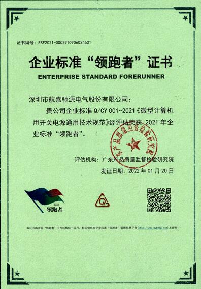 2022年1月20日,航嘉集团在企业标准信息公共服务平台 (https://www.qybz.org.cn/)上公布的《QCY001-2021 微型计算机用开关电源通用技术规范》标准,经评估获得2021年企业标准“领跑者”殊荣。其评估机构为广东省质量监督检验研究院,工作机构为中国标准化研究院。这一殊荣说明作为计算机电源行业知名品牌的航嘉,不论是在标准的创新上还是产品的质量管控上都已领先行业发展。