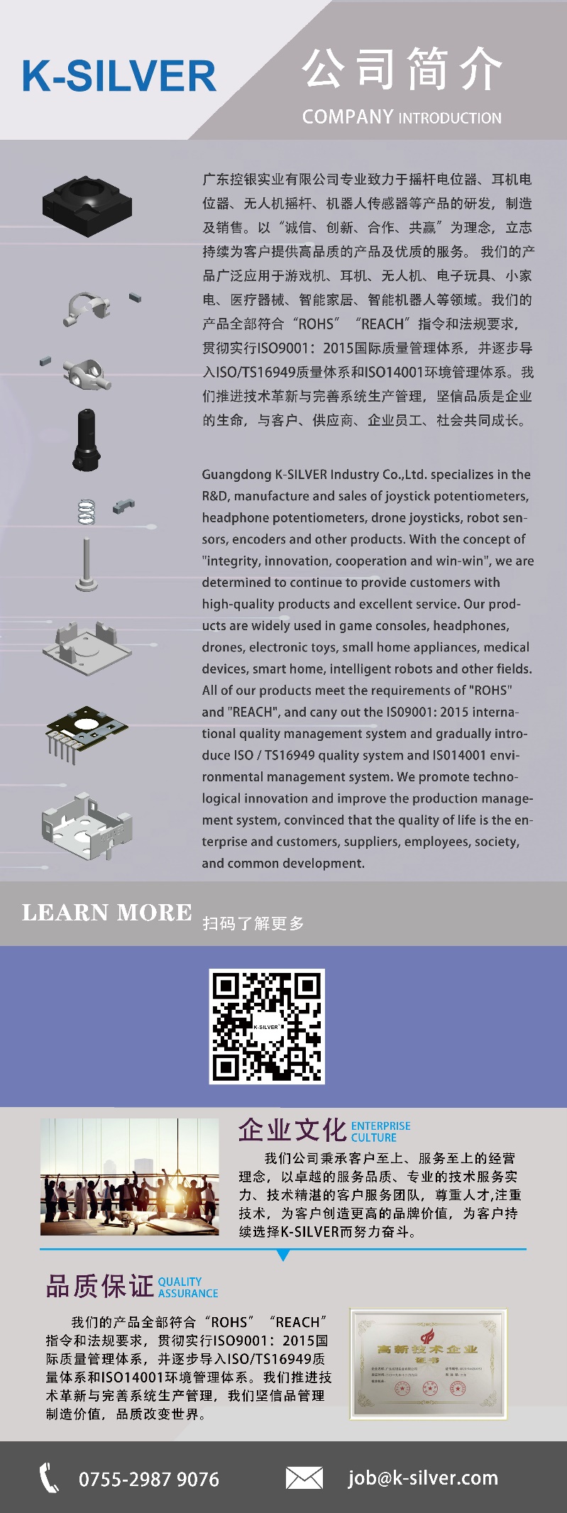 广东控银实业有限公司(K-SILVER)于 2016 年在深圳成立,专业致力于游戏摇杆、无人机摇杆、耳机电位器、机器人传感器等产品的研发、制造及销售,属于国家高新技术企业。以“诚信、创新、合作、共赢”为理念,立志持续为客户提供高品质的产品及优质的服务。与微软、雷蛇、Backbone、GAMESIR、北通、八位堂、飞智、雷神、机械师、莱仕达、PDP、GPD 等品牌保持着长期的友好合作关系。