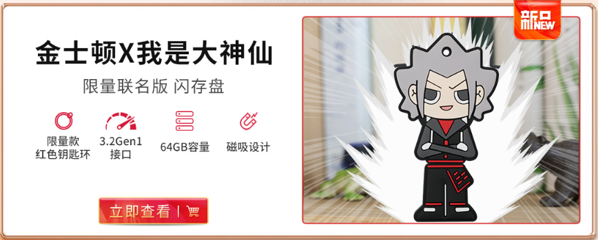 金士顿《我是大神仙》限量联名版闪存盘细致刻画,神还原主角色彩,手感舒适的塑胶材质,分体式结构便于使用和保护数据接口,64GB充裕存储空间搭配USB 3.2 Gen1高速接口,高清照片、4K视频分分钟搞定,并且限量版还配备了独具特色的红色钥匙环,方便随身携带。区别其他闪存盘,《我是大神仙》限量联名版闪存盘还采用了冰箱贴设计,可吸附在机箱或者冰箱上,不仅使用性强,更具收藏价值。