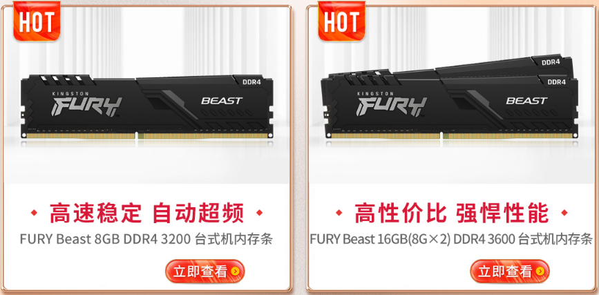内存首选Kingston FURY野兽(Beast)DDR4 3200台式机内存8GB,作为高性价比的内存,野兽 DDR4系列内存针对新款Intel和AMD芯片组进行优化,是经济实惠的高性能升级方案,并且新版本的散热器外观更加时尚酷炫,不仅便于安装,高效率的散热让内存在高强度工作状态下依然可以保持静爽高效。此外,这款主流规格的内存还有DDR4 3600 8GB x 2的套条可选,性能、兼容性、稳定性更高,适合组双通道提升整机性能。