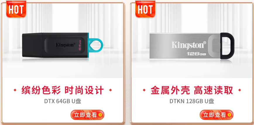 闪存盘也有多种选择,金士顿DTX闪存盘64GB和金士顿DTKN闪存盘128GB是当前热卖的两款爆品,前者拥有缤纷色彩时尚设计,后者则拥有金属外壳坚固耐用。两款均为USB 3.2 Gen1闪存盘,读取速度可达200MB/s,消费者按需选择适合自己的容量即可。
