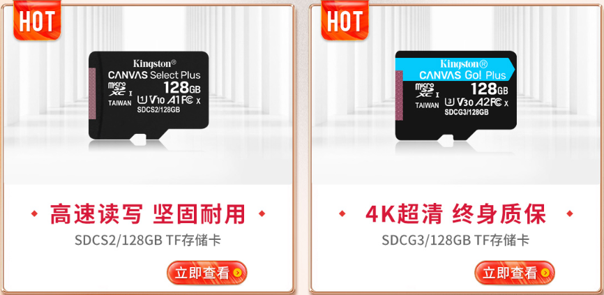 存储卡选择有学问,经济实惠首选金士顿SDCS2存储卡128GB,智能手机、可穿戴产品等数码产品均可使用,但如果拍摄4K超清视频或者连拍摄影,推荐金士顿SDCG3存储卡128GB,更高的读写速度有效避免视频丢帧、失声,图像缺失等因为速度问题导致的数据缺失。