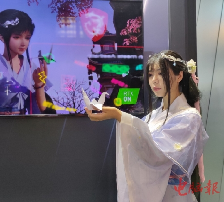 在光追和DLSS技术的加持下,屏幕画面完美再现了NVIDIA展台前来参加的《仙剑奇先转》coser的经典人物形象和姿势