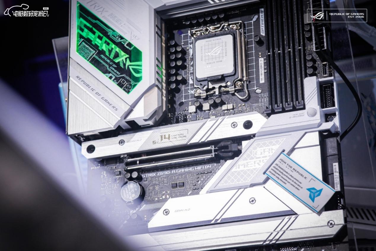 现场展出的还有旗舰级主板ROG MAXIMUS Z690 EXTREME,采用24+1供电模组(105A),具备新一代AniMe Matrix LED光显矩阵屏和2英寸LiveDash OLED系统显示屏,适合发烧玩家体验。