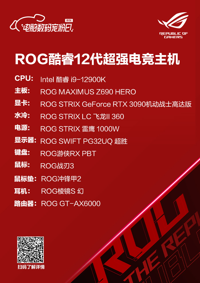 黑色主题的ROG酷睿第12代超强电竞主机则搭载了当下intel最强旗舰酷睿i9 12900K,以ROG MAXIMUS Z690 HERO为核心,承继ROG玩家国度DNA优异基因,低调奢华的外观之下蕴藏硬核性能。
